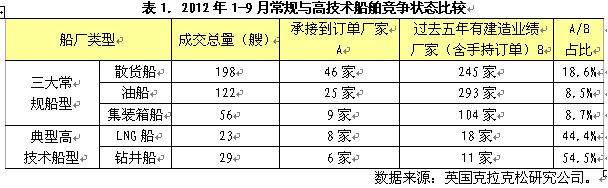 當(dāng)人們欣喜看到2010年船舶市場“強勁復(fù)蘇”,寄希望2011年仍能保持這種態(tài)勢的時候,2011年世界經(jīng)濟、貿(mào)易、航運市場風(fēng)云突變,船舶市場外部環(huán)境再度發(fā)生惡化,加上隱藏于船舶市場船舶產(chǎn)業(yè)深層次矛盾與問題的不斷暴露,船舶市場重返下行通道,2012年這種情況變得更為糟糕。按克拉克松公司統(tǒng)計,2012年1-9月全球累計成交新船訂單781艘、3230萬載重噸,月均360萬載重噸,較上一年月均成交量下滑46%,甚至比2009年月均水平(上次谷底)還低25%,呈典型“二次探底”之勢。隨著成交量的持續(xù)萎縮,新船價格進一步下滑,2012年9月底克拉克松新船價格指數(shù)報收于127點,較上年底下跌12點,并創(chuàng)下2008年價格下行以來的新低。