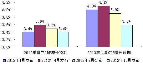 2012年一季度,在世界各國聯(lián)手干預(yù)政策及短期負(fù)面因素消失的推動下,世界經(jīng)濟下滑趨勢與通脹風(fēng)險得到一定程度受控。4月份,國際貨幣基金組織甚至上調(diào)了全球經(jīng)濟增長預(yù)期。但是,進入到二季度,因希臘與西班牙問題再度重演,歐債危機再度惡化,對世界實體經(jīng)濟產(chǎn)生了新的負(fù)面影響。歐美發(fā)達經(jīng)濟體復(fù)蘇緩慢,中、印度等大宗商品需求國經(jīng)濟增速回落超預(yù)期,再度把世界經(jīng)濟推向“二次探底”的邊緣,7月份IMF下調(diào)了全球經(jīng)濟增長預(yù)期,經(jīng)濟發(fā)展前景頓時再生變數(shù)。進入三季度,二季度產(chǎn)生的不利因素對實際經(jīng)濟影響進一步深化,全球經(jīng)濟體出現(xiàn)罕見的同步下滑態(tài)勢,新興經(jīng)濟體一直以來作為全球經(jīng)濟復(fù)蘇的貢獻者,也因外需疲軟,內(nèi)需動力減弱而呈明顯的下降趨勢,鑒于此,10月份IMF在7月份的預(yù)測基礎(chǔ)上再度下調(diào)了今明兩年經(jīng)濟增長預(yù)期。