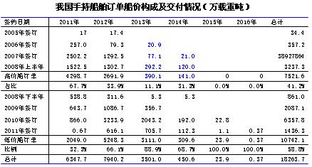 手持訂單中,低價船(危機(jī)爆發(fā)后承接訂單)所占比例接近60%,2012年交付訂單中低價船訂單所占比例預(yù)計(jì)將達(dá)66%,而2013年這一比例接近90%。
