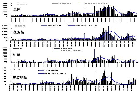 1) 導(dǎo)致市場反應(yīng)滯后:航運(yùn)一般滯后經(jīng)濟(jì)3~6個月,而造船生產(chǎn)滯后航運(yùn)市場1.5~2.5年。從而,造船生產(chǎn)業(yè)績指標(biāo)滯后經(jīng)濟(jì)2~3年。