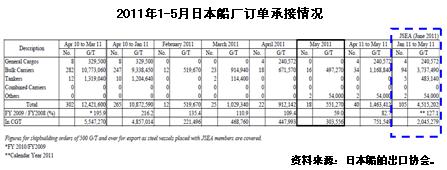 根據(jù)日本造船協(xié)會統(tǒng)計(jì),2011年1-5月日本造船業(yè)承接出口船訂單105艘、205萬修正總噸(較克拉克松公司統(tǒng)計(jì)高出150萬修正總噸);