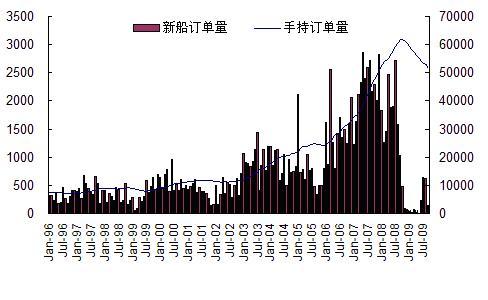據(jù)英國(guó)克拉克松公司統(tǒng)計(jì),今年1-9月全球累計(jì)成交新船238艘、1896萬(wàn)載重噸,同比下降88.3%;截止到2009年9月底,全球手持船舶訂單總量降至8671艘、5.17億載重噸,以載重噸計(jì),較去年10月歷史最高位下降了20%。
