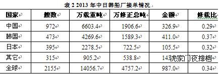 2013年,中國船廠接單總量依然保持全球第一,接單金額與韓國存在差距。以艘、載重噸和修正總噸計算,中國船廠的市場份額分別為45.1%、47.0%和40.1%,分別高于韓國船廠23.2、16.6和6.7個百分點;但按照接單金額計算,中國船廠的市場份額僅為33.1%,低于韓國船廠41.6%的市場份額,修載比也遠低于韓國船廠。這反映了中國船廠在高價值船舶承接上仍處于相對弱勢。